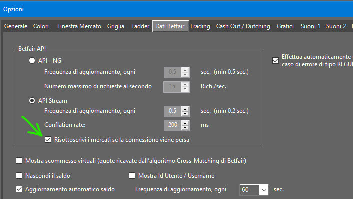 Vai su OPZIONI poi DATI BETFAIR e metti la spunta su Risottoscrivi i mercati se la connessione viene persa.