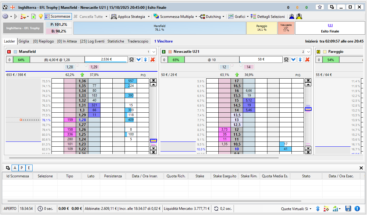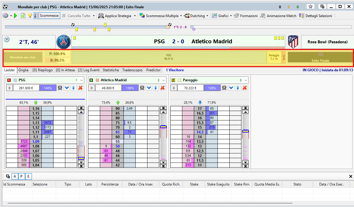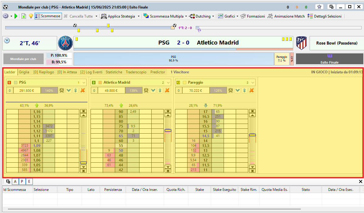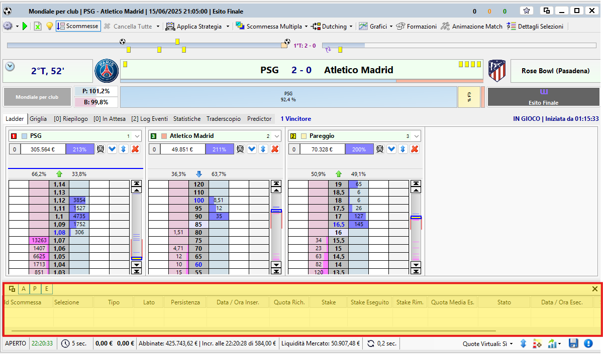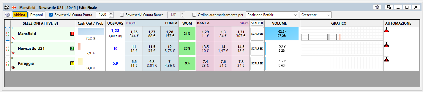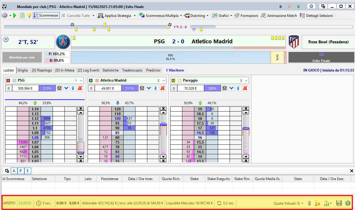 La Finestra Mercato di Betting Toolkit dal punto di vista pratico costituisce la parte più importante del programma dato che è proprio qui che si concentrano tutte le attività che il giocatore o il trader compiono quando decidono di operare nel mercato exchange di Betfair.